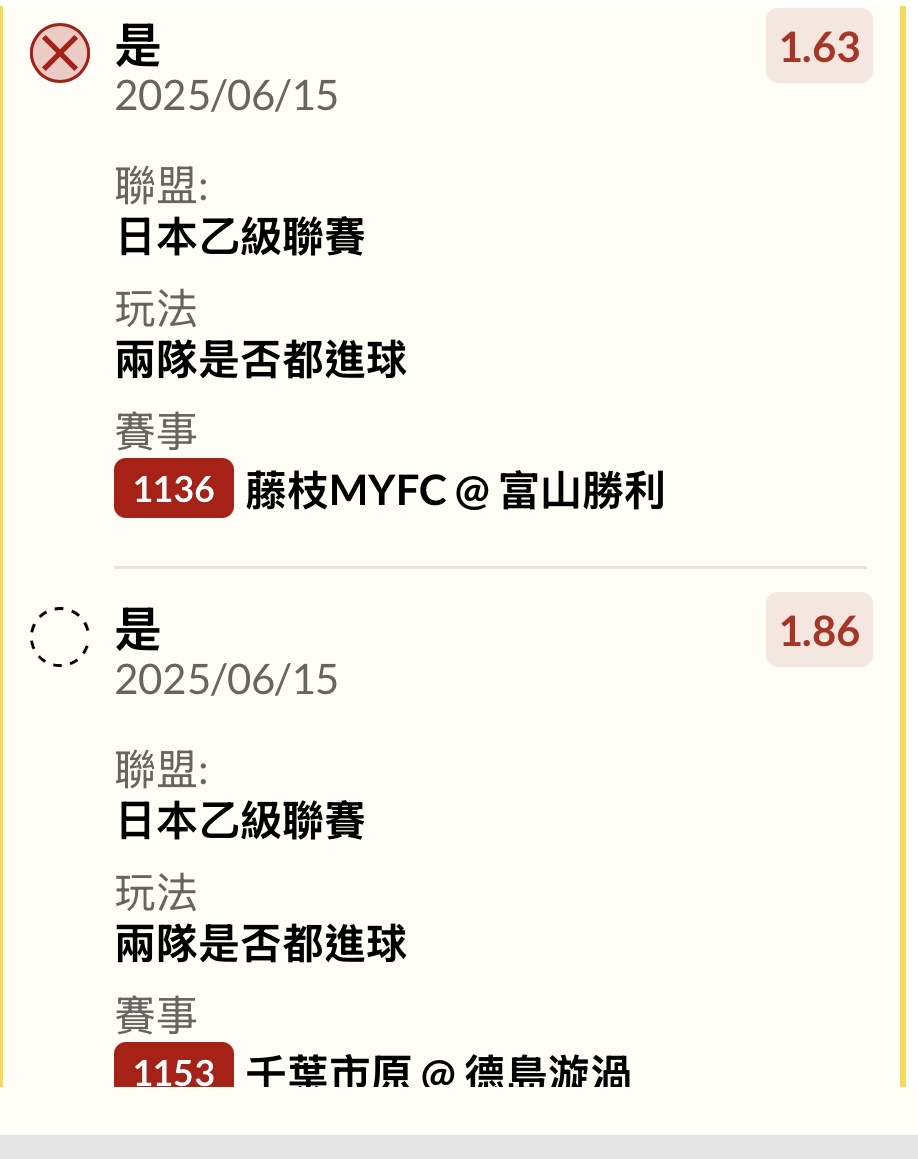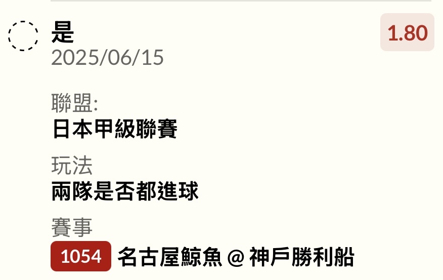 感覺大便場 名古屋鯨魚@神戶勝利船 44‘ 神戶勝利船(OG) 45’+2 神戶勝利船 ——- 0:2 H T ——- 57’ 名古屋鯨魚 ——- 1:2 F T ——- -- ※ 發信站: 批踢踢實業坊(www.ptt-website.tw), 來自: 49.218.211.116 (臺灣) ※ 文章網址: https://www.ptt-website.tw/SportLottery/M.1749977858.A.943