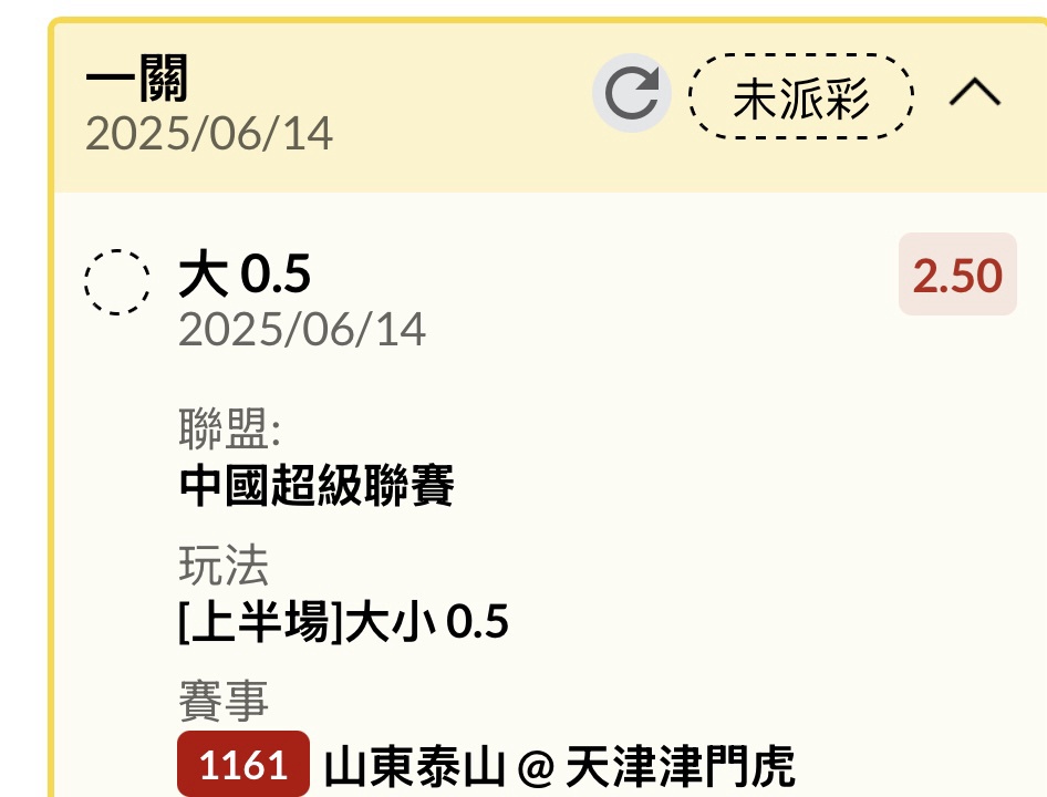 山東泰山 @ 天津津門虎 0-1 HT 0-1 FT ----- Sent from JPTT on my iPhone -- ※ 發信站: 批踢踢實業坊(www.ptt-website.tw), 來自: 111.83.2.2 (臺灣) ※ 文章網址: https://www.ptt-website.tw/SportLottery/M.1749902428.A.8BF