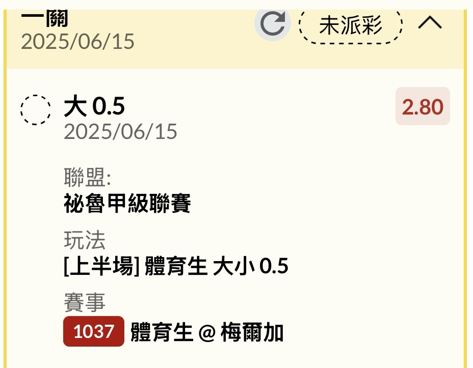 體育生 1 - 2 梅爾加 44' 體育生 HT-- 1:0 -- 62' 梅爾加 69' 體育生() 74' 梅爾加 FT-- 1:2 -- 秘魯甲 -- ※ 發信站: 批踢踢實業坊(www.ptt-website.tw), 來自: 1.165.124.58 (臺灣) ※ 文章網址: https://www.ptt-website.tw/SportLottery/M.1749926711.A.4AB
