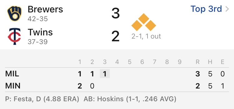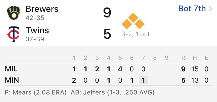 2025 Major League Baseball regular season Target Field, Minneapolis, Minnesota https://i.imgur.com/jHoT6Q2.jpeg Milwaukee Brewers 42-35 Minnesota Twins 37-39 密爾瓦基釀酒人 勝 1.90 密爾瓦基釀酒人1分 6.00 -- ※ 發信站: 批踢踢實業坊(www.ptt-website.tw), 來自: 111.83.154.78 (臺灣) ※ 文章網址: https://www.ptt-website.tw/SportLottery/M.1750610715.A.33D