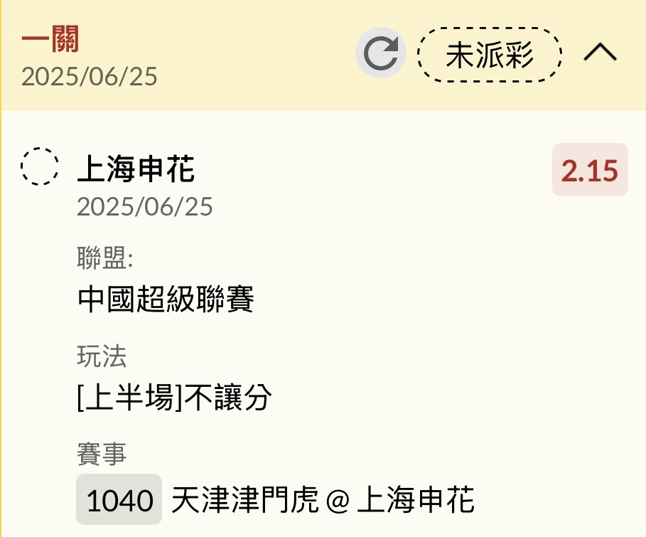 天津津門虎@上海申花 0-3 上海申花 42‘ 上海申花 45+4’ 上海申花 90+5‘ ----- Sent from JPTT on my iPhone -- ※ 發信站: 批踢踢實業坊(www.ptt-website.tw), 來自: 42.76.179.89 (臺灣) ※ 文章網址: https://www.ptt-website.tw/SportLottery/M.1750849370.A.3AA