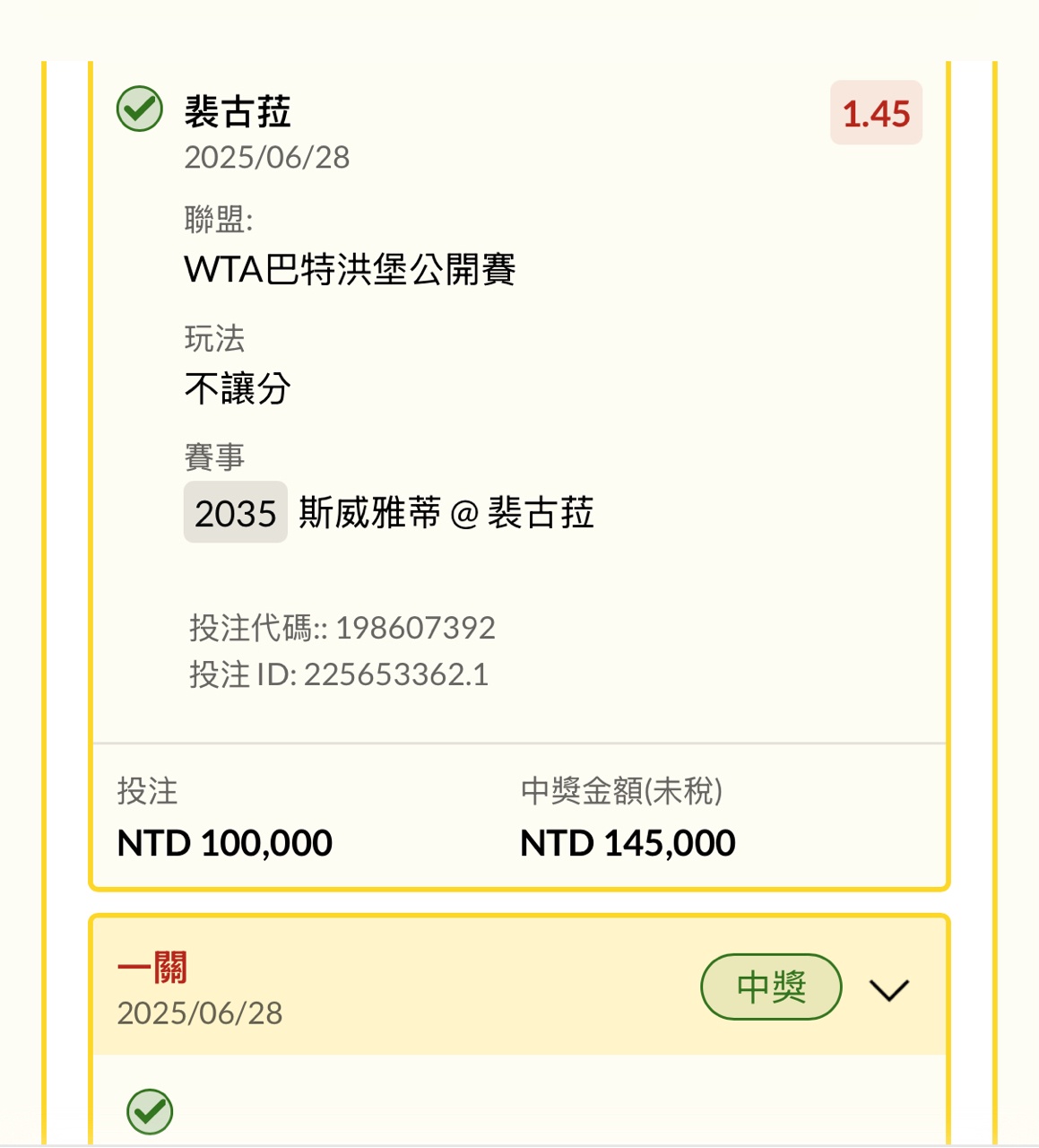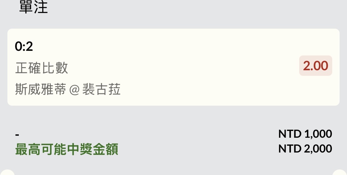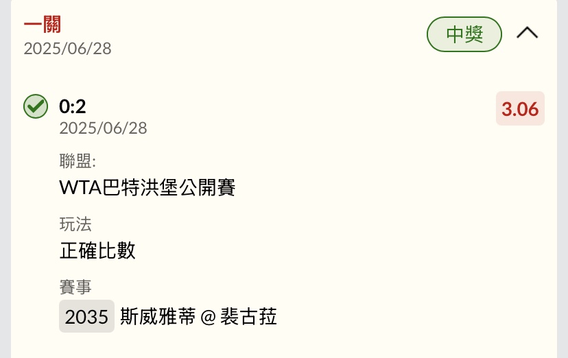 斯威雅蒂@裴古菈 0-2 第一盤 4:6 第二盤 5:7 第三盤 ----- Sent from JPTT on my iPhone -- ※ 發信站: 批踢踢實業坊(www.ptt-website.tw), 來自: 223.138.175.195 (臺灣) ※ 文章網址: https://www.ptt-website.tw/SportLottery/M.1751111145.A.026