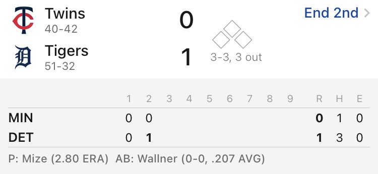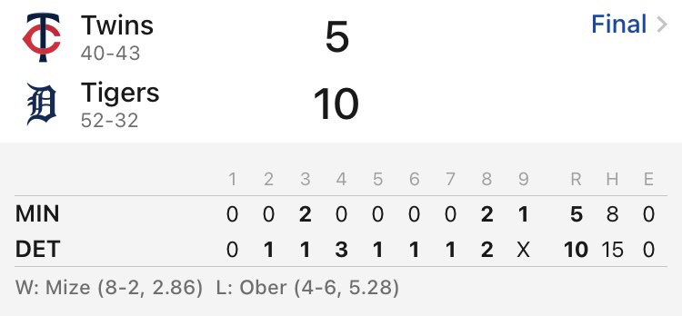 2025 Major League Baseball regular season Comerica Park, Detroit, Michigan https://i.imgur.com/A76flMZ.jpeg Minnesota Twins 40-42 Detroit Tigers 51-32 底特律老虎 勝 1.50 底特律老虎1分 4.00 -- ※ 發信站: 批踢踢實業坊(www.ptt-website.tw), 來自: 42.79.194.73 (臺灣) ※ 文章網址: https://www.ptt-website.tw/SportLottery/M.1751126436.A.90A