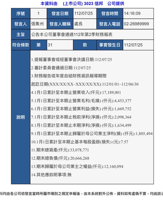 1. 標題:3023 信邦 112年Q2財報