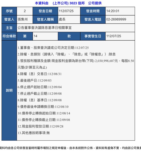 標題[情報] 3023 信邦 112年Q2財報&除息基準日