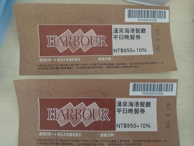 物品: 海港平日晚餐券*2 (950+10%)