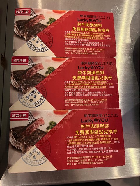 物品名稱:沃克牛排主餐第二套半價券3張/