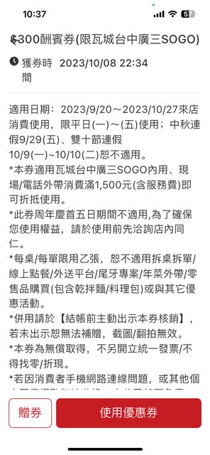 標題賣 瓦城300酬賓券
