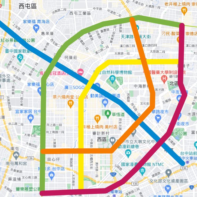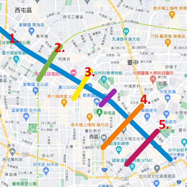 比如 X 軸中港路 Y 軸五權路, 灑下 45 度菱格網, 一公里一條路線