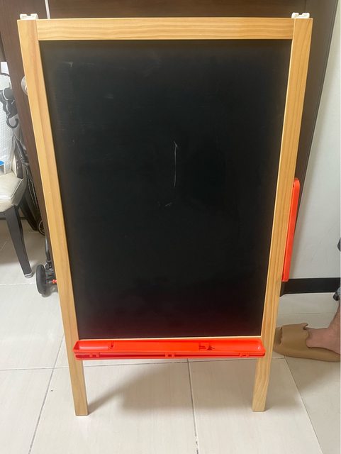 敘述:一面是黑板一面是白板,也可以另外掛畫紙。黑板側未使用,白板上有些微刮痕。