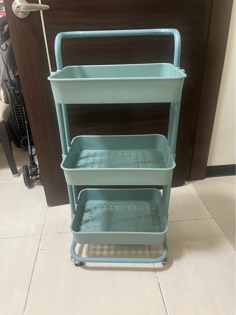 敘述:置物區的材質是塑膠,框架是五金,底下有輪子。建議開車載運。