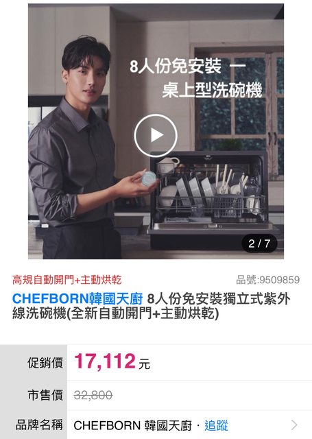 物品名稱:CHEFBORN韓國天廚 8人份免安裝獨立式紫外線洗碗機(自動開門+主動烘乾)