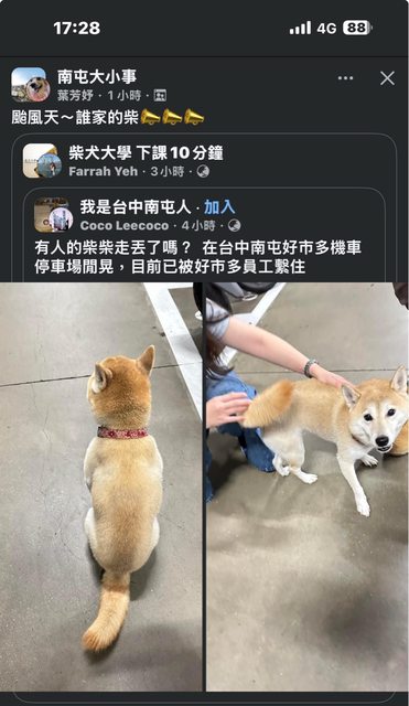臉書社團看到,南屯好市多附近有柴柴走丟了, 希望柴柴可以早點回家。 -- ※ 發信站: 批踢踢實業坊(www.ptt-website.tw), 來自: 49.217.133.38 (臺灣) ※ 文章網址: https://www.ptt-website.tw/TaichungBun/M.1730367390.A.A76