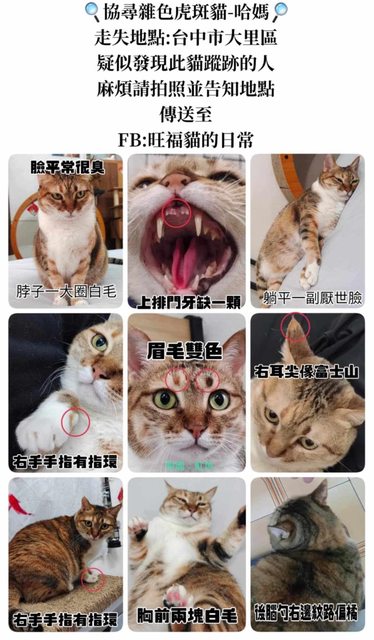 標題[協尋] 走失 台中大里 雜色虎斑母貓-哈媽