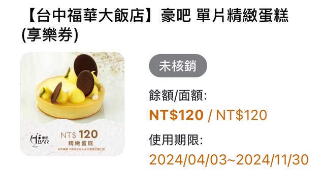 標題[交易] 台中福華大飯店豪吧單片精緻蛋糕券