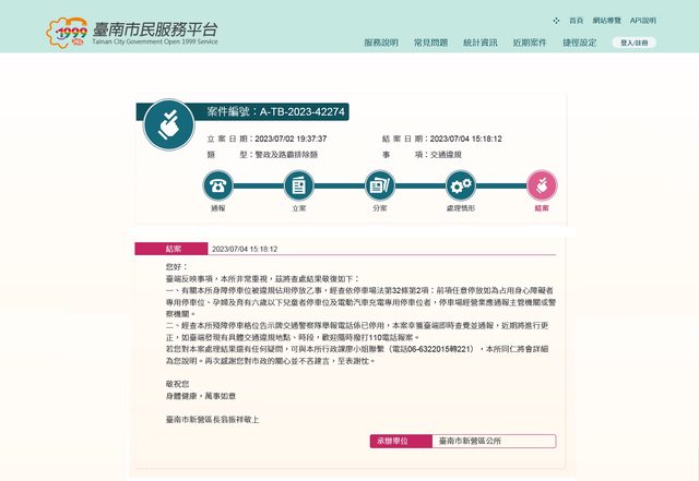 所以我就寫了1999反映,並且我還特地去區公所溝通這是路外停車場,千萬不要推給警察處