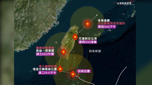 方之後,就會開始慢速大角度轉向,預估將以巔峰狀態在週三(02)中午左右,於高雄-屏