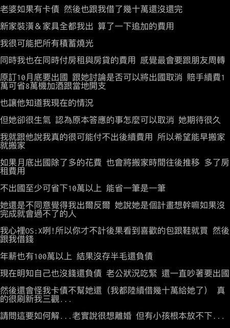 在某板看到他的老婆是錢坑愛亂花錢不顧後果 收入高但負債也不考量現實情況還怪先生 這種情況還有救嗎?或是離婚比較好? -- ※ 發信站: 批踢踢實業坊(www.ptt-website.tw), 來自: 180.217.24.202 (臺灣) ※ 文章網址: https://www.ptt-website.tw/WomenTalk/M.1727702481.A.573