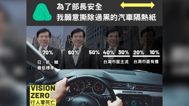 : 行人零死亡推動聯盟以隔熱紙的透光度暗諷部長。(圖片來源/ 翻攝自行人零死亡推動聯 : 盟臉書) : 聯盟指出多數民眾貼上隔熱紙主要是為了隔熱與隱私,但是這些都不是隔熱紙過黑的理由 : ,以隔熱來說,顏色的深淺根本不影響隔熱,主要是依據材質區分隔熱係數,但是部長說 : 明天氣熱會影響生活,但深色其實更會吸熱。至於隱私的部分,聯盟表示必須和其他用路 : 人視線交流確保行車意圖也避免誤會,同時執法人員也能清楚的看到車內駕駛人的行為, : 否則過黑的隔熱紙也阻擋執法單位難以針對玩手機的駕駛取締;另外也和交通部長喊話, : 難道世界各國針對隔熱紙的透光度規定,都是在玩扮家家酒的嗎? : https://i.imgur.com/dGdIwKe.jpg