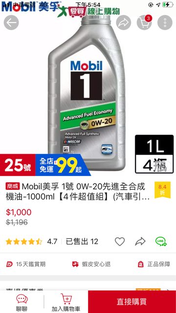 最近里程數快到1000公里,詢問業務1000公里保養內容需更換機油,價格約在3500元左右 ,約略知道價格大多貴在機油,雖然聽業務口氣是不希望自備機油,但由於價格實在差很 多,還是興起了自備0W-20機油的念頭,雖然到時候可能會被原廠白眼@@ 想請問照片中的美孚1號0W-20機油是否還不錯呢? https://i.imgur.com/HxRbDYH.jpg