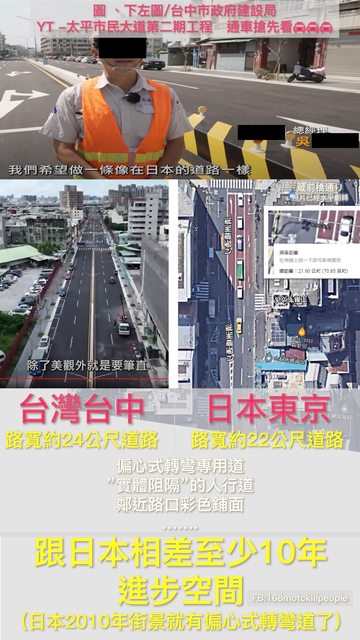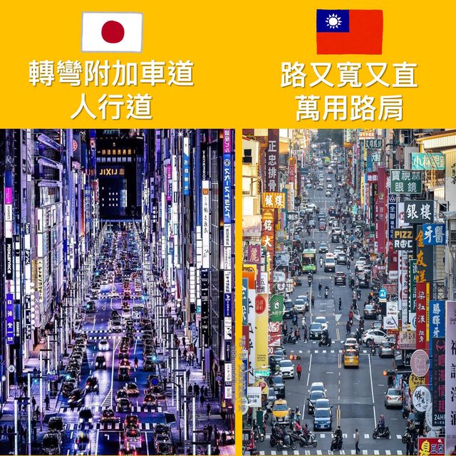 東京:轉彎附加車道,人行道 高雄:路又寬又直,萬用路肩,停車、人行超萬用 第二張–台中 vs 東京 https://i.imgur.com/YxGmS6v.jpg