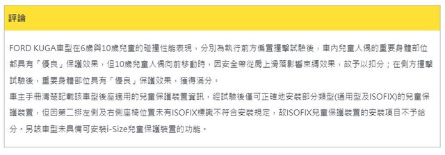 FORD KUGA車型在6歲與10歲兒童的碰撞性能表現,分別為執行前方偏置撞擊試驗後,車內 兒童人偶的重要身體部位都具有「優良」保護效果,但10歲兒童人偶向前移動時,因安全 帶從肩上滑落影響束縛效果,故予以扣分;在側方撞擊試驗後,重要身體部位具有「優良 」保護效果,獲得滿分。 車主手冊清楚記載該車型後座適用的兒童保護裝置資訊,經試驗後僅可正確地安裝部分類 型(通用型及ISOFIX)的兒童保護裝置,但因第二排左側及右側座椅位置未有ISOFIX標識不 符合安裝規定,故ISOFIX兒童保護裝置的安裝項目不予給分。另該車型未具備可安裝 i-Size兒童保護裝置的功能。 雖然有配備但因為沒有ISOFIX標示不符規定,所以該項目不予給分 這會是三星的原因嗎? -- ※ 發信站: 批踢踢實業坊(www.ptt-website.tw), 來自: 124.199.89.174 (臺灣) ※ 文章網址: https://www.ptt-website.tw/car/M.1695698724.A.41A