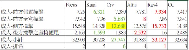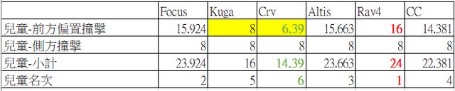成人部分: 進口車RAV4無庸置疑表現最佳 Focus硼鋼加持僅輸進口光環的RAV4 CC、Altis換底盤也不再是鋁罐車 最讓人傻眼的是Kuga,硼鋼分佈比Focsu還多表現竟然最差,假人受傷的程度最多,真的是? 貨車造成安全性變差嗎? 最後Crv分數雖然最低,但實際撞擊表現不輸給Kuga,因爲側撞氣囊沒爆開,導致額外被扣? 數,整體來說假人受傷程度比Kuga好 *黃底是因氣囊沒爆或安全帶滑落導致額外扣分 https://i.imgur.com/tD9Rrq5.jpg