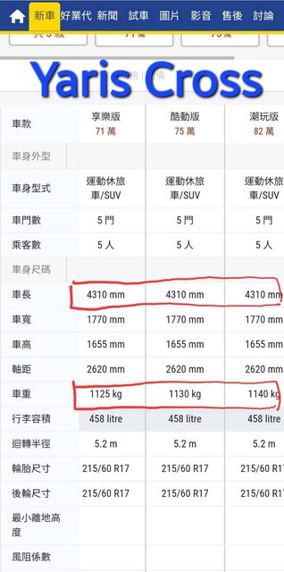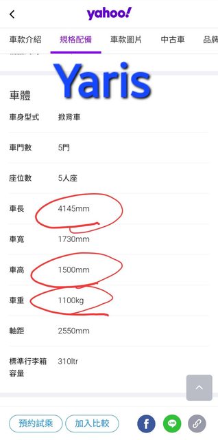 車長 4145mm 車高 1500mm 車重 1100kg 這是Yaris Cross的規格 https://i.imgur.com/RlkTtTg.jpg