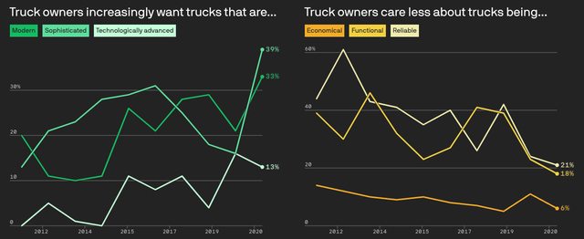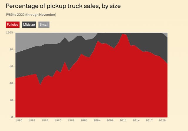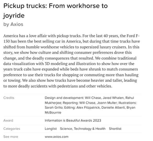 我們結合傳統的資料可視化、3D建模和插畫來展示多年來,因消費者更傾向使用皮卡車