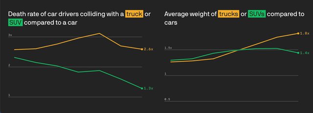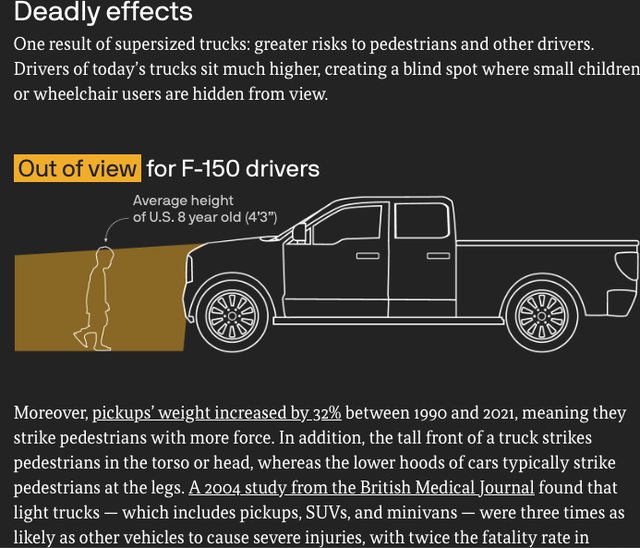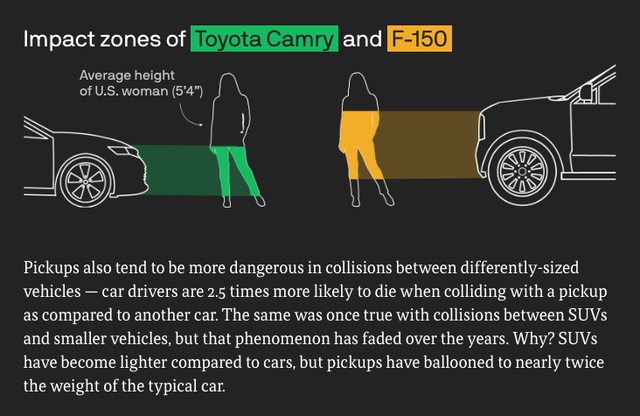 我們還指出皮卡車變得更重、更高,導致與行人和其他車輛的意外更加致命。