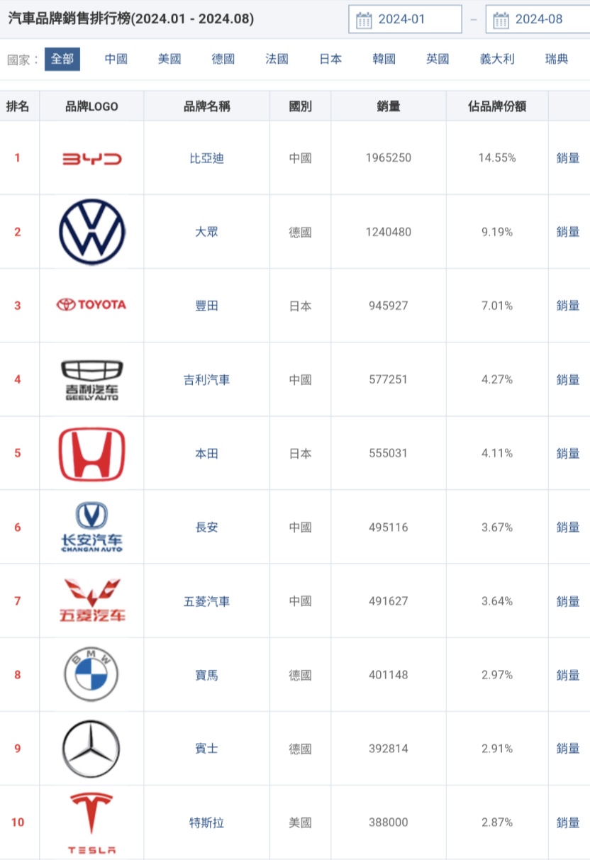推 godog: 2024上半年 豐田以經不到前5 排第6 10/10 13:30
