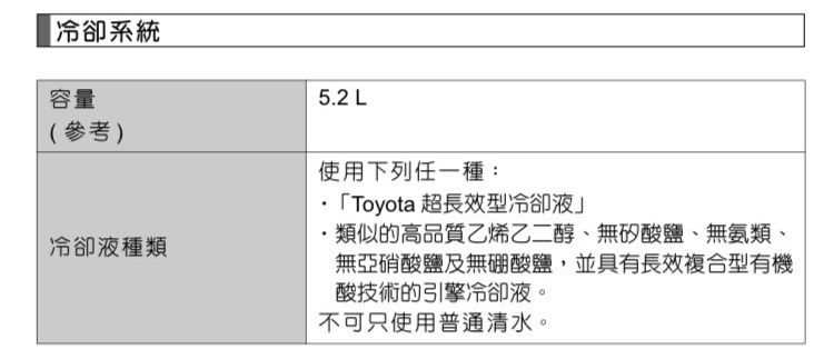 → f023221: 豐田原廠說明書,只能補原廠比例配好的冷卻水 11/16 20:31