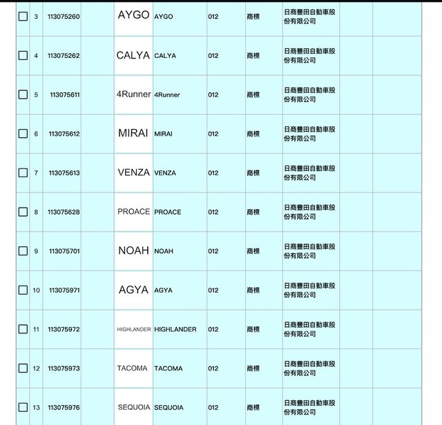 : Toyota 在台灣註冊多個車名。(圖片來源:擷取自智慧財產局)