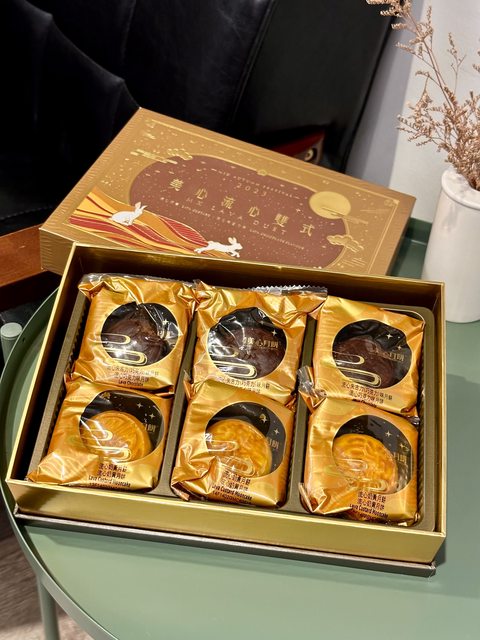 家裡身價最高的中秋禮盒,今年的包裝設計我覺得蠻美的,這款有流心奶黃和流心巧克力