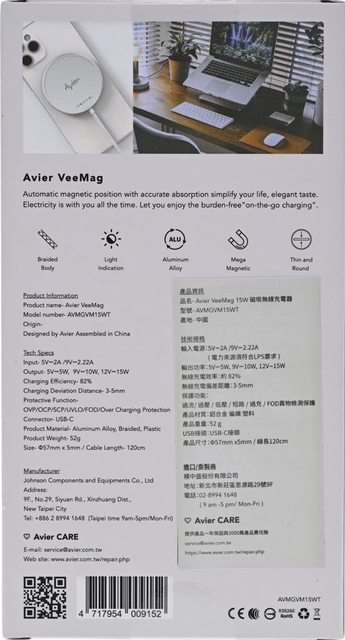 Avier VeeMag 15W 磁吸無線充電盤(AVMGVM15WT)規格: