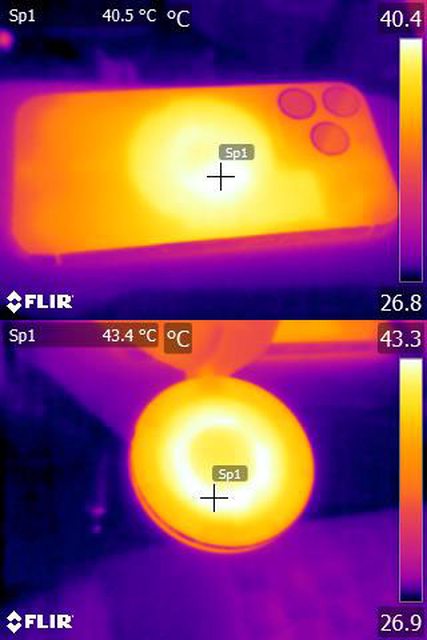▼無線充電30分鐘後Apple iPhone 15 Pro背面及Avier VeeMag正面的紅外線熱影像圖