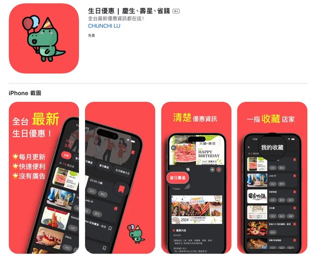 【開發初衷】 每次和親朋好友過生日時 臨時找適合的生日優惠會很麻煩... 因為有時查網頁或IG上的發文 不是沒圖片就是資訊不明確 所以才想做一個可篩選優惠條件和有優惠圖片的 APP 【未來展望】 1. 持續補充更多優惠店家資訊 2. 文案可以排版更整齊 3. 補充店家地址 ..等等 【心得】 最難的不是開發過程,而是上架和蘋果嚴格的審核... 光審核就花了一個月了(汗 【結語】 希望這款 APP 能幫助一樣有尋找生日優惠煩惱的人 後續也會持續改善雙平台的生日優惠 APP 如果有任何問題或想回饋的 歡迎再讓我知道唷 有興趣可以下載玩玩 謝謝各位~~ --- 最後為了慶祝雙平台上線發 P 幣! 請推文 生日優惠APP 最新優惠資訊都在這! 每十推發送 50P 幣,共發十位不重複 ID 唷 oNaokio esdj11 wadechennn SDNS Neil000 juniork fylin LoYuMing baupi j73628 以上發送囉~ --- 【P幣加碼活動】 下載並留五星評論(請附上 PTT 帳號) 送 50P 幣 雙平台各取前五位,不重複 ID 唷 -- ※ 發信站: 批踢踢實業坊(www.ptt-website.tw), 來自: 118.166.136.200 (臺灣) ※ 文章網址: https://www.ptt-website.tw/iOS/M.1710895363.A.A3C