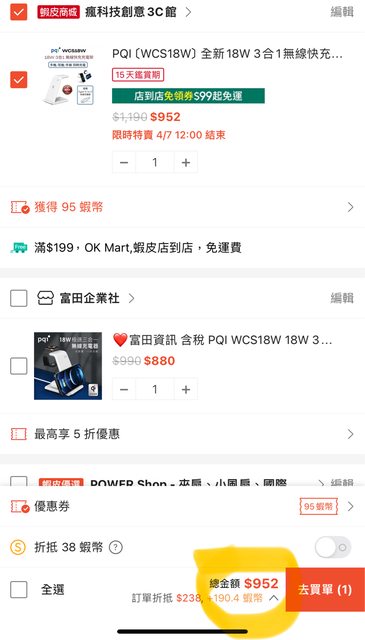 特賣價952-10%蝦幣折扣95=857