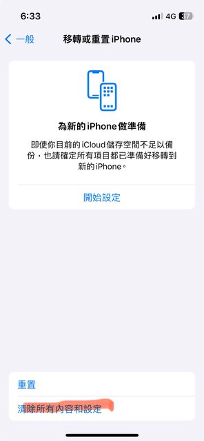 目前清除所有內容和設定後,