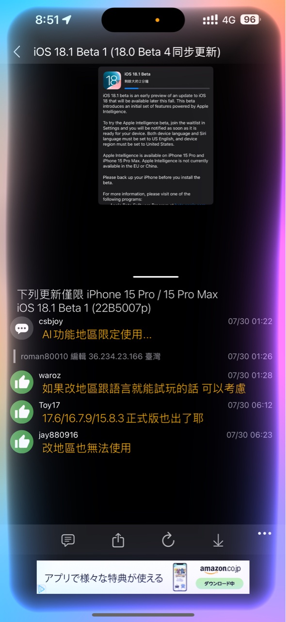 → wl02438843: 15pro max 18.0 beta 4服用中 07/30 11:20
