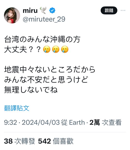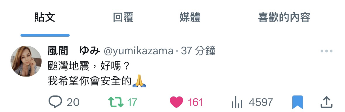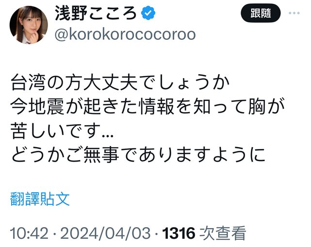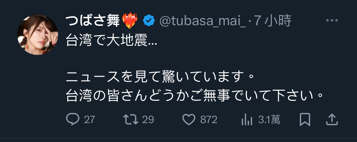 早上8點台灣本島發生大地震 日本AV女優紛紛在推特上發文祈福 祈禱台灣沒事 miru https://i.imgur.com/9MvSE9s.png