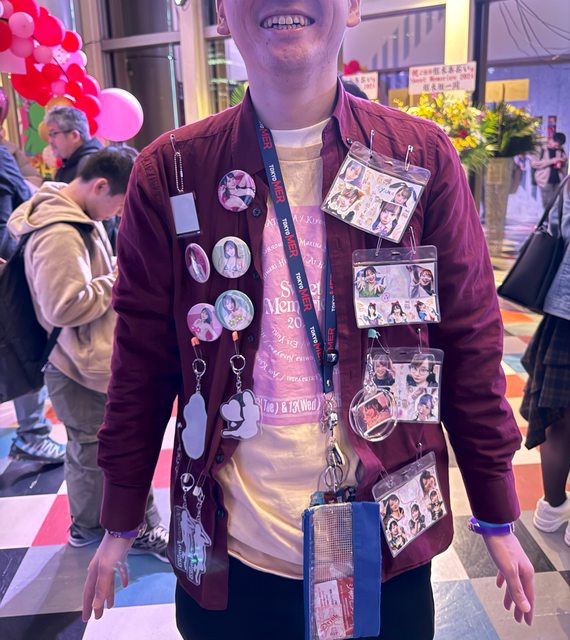 以下是會場外的一位鐵粉,身上直接掛滿各種週邊,我看得瞠目結舌,忍不住跑去問能不