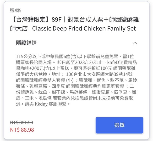 更新:agoda已經把頁面關閉了,有買到的人請注意,經詢問,101票券需在憑證上的預約 時間進場,師園的部分,憑證自開立起一年內皆有效 ------------------------------------------------------------- https://shorturl.at/ijuBK 剛剛在爬agoda內的活動裡面發現101門票+師園鹹酥雞方案非常優惠,一個人只要89元, 鹹酥雞的價值就高達510元了! 票券是由kkday發行,但是買來貌似鹹酥雞的券效期只有預約當天? 根據票券供應商kkday上的價格,agoda這檔是以1折價販售 https://i.imgur.com/a340ee6.jpg