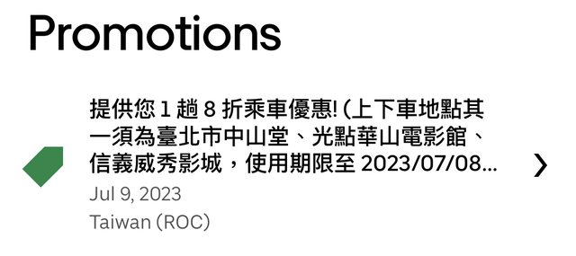 北影影迷專屬優惠: 於6/22-7/8台北電影節影展期間 新用戶輸入乘車優惠序號「TFFNEW2023」享單趟 NTD $150 乘車優惠 不限新舊用戶輸入乘車優惠序號「TFF2023」享單趟 8折 優惠(最高折抵 NTD $50) 一個帳戶限使用一次 -- ※ 發信站: 批踢踢實業坊(www.ptt-website.tw), 來自: 118.167.64.228 (臺灣) ※ 文章網址: https://www.ptt-website.tw/Lifeismoney/M.1687710446.A.5BC