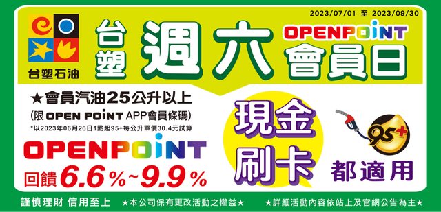 週六openpoint會員日 (感覺快要變成常態了哈哈 活動日期:112/07/01~112/09/30 (1)以台塑聯名卡支付加油消費,按當筆加油發票金額OPEN POINT點數回饋9.9%。 (2)以現金或台塑聯名卡以外之信用卡支付加油消費,按當筆加油發票金額OPEN POINT點數回饋6.6%。就算沒有聯名卡,加一千塊還是能換66點 適用通路 : 台塑石油(依站上實際公告為主)、台亞、福懋、統一精工、西歐及久井等加油站通路 https://i.imgur.com/e5rQ1VP.jpg