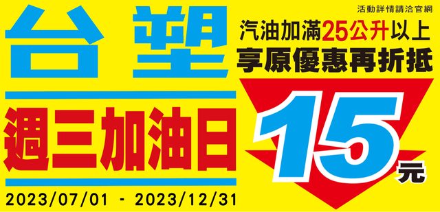 週三加油日 改成25公升折15了(原先我記得是35折20) 門檻降低,對大家應該更實用 活動日期:112/07/01~112/12/31 適用通路:台塑石油、台亞、福懋、統一精工、全國、西歐、久井及山隆17站等加油站通路 週三加油日通路跟週六會員日有稍稍不同喔,期限也比會員日多三個月 雖然不知道會員日會不會繼續延長就是了 ----- Sent from JPTT on my iPhone -- ※ 發信站: 批踢踢實業坊(www.ptt-website.tw), 來自: 223.139.7.61 (臺灣) ※ 文章網址: https://www.ptt-website.tw/Lifeismoney/M.1688359765.A.180