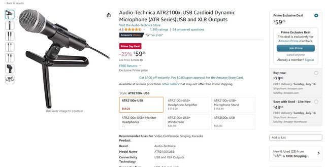 如圖ATR-2100x麥克風有amazon prime會員的話是60美元,沒會員不會顯示這個優惠 而ATR-2500x麥克風是80美元,這個也許不用prime會員, 兩者我都是取Amazon自營售價。 沒有會員且沒帳號的可以辦完帳號後,申請試用Amazon prime會員 賣場網址:https://tinyurl.com/atr21x -- ※ 發信站: 批踢踢實業坊(www.ptt-website.tw), 來自: 68.181.16.206 (美國) ※ 文章網址: https://www.ptt-website.tw/Lifeismoney/M.1689142454.A.4BC