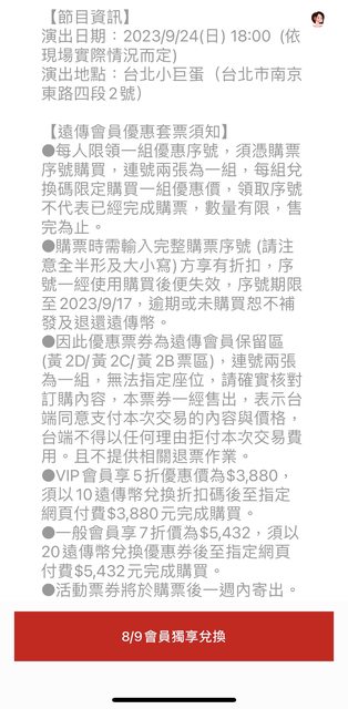 去年愛你翻紅之後還是有差 演唱會難搶很多 記得上一次的巡迴票就沒有這次那麼難搶 如果有多的遠傳幣也想去看演場會的可以去心生活搶搶看特價票 兌換時間是9號開始 應該是凌晨就可以換了 場次是9/24的 特價票的區域是黃2D/黃2C/黃2B (原票價3880) 票券是兩張連號一組 一般會員可以用20遠傳幣換7折的購票序號 票價是5,432 (兩張票) VIP可以用10遠傳幣換5折的購票序號 票價是3,880(兩張票) https://i.imgur.com/mnsemnf.jpg
