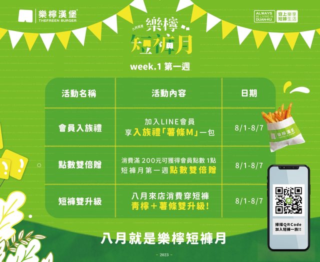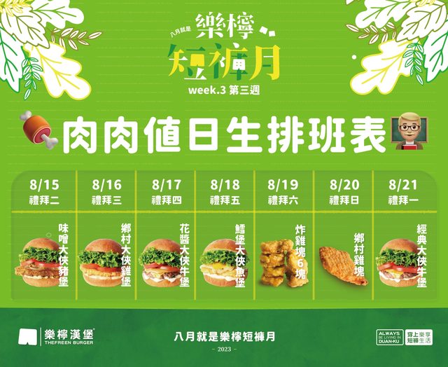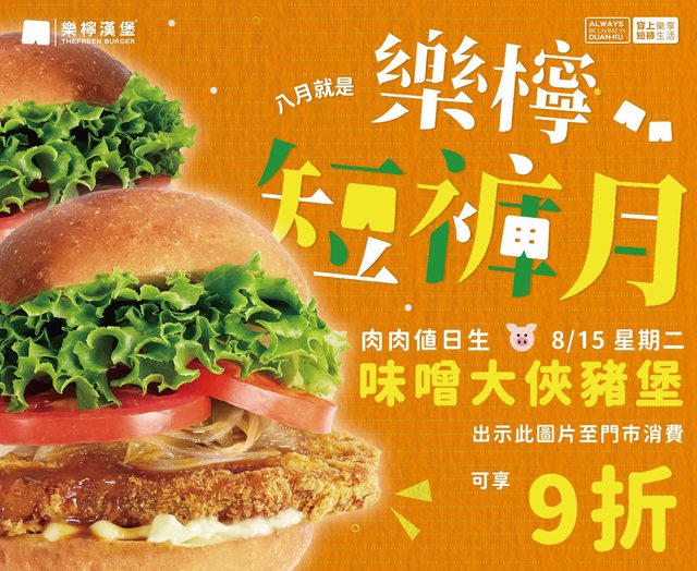 如圖 樂檸最近活動蠻多的 這週是肉肉值日生 每天都有一個漢堡優惠 今日是味噌大俠豬9折 然後8月穿短褲薯條飲料都可以免費加大 加入會員還有入會禮薯條一包 https://i.imgur.com/mVjroSW.png