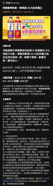 標題[情報] 8/23-9/19 萊爾富悠卡消費150元送茶裏王